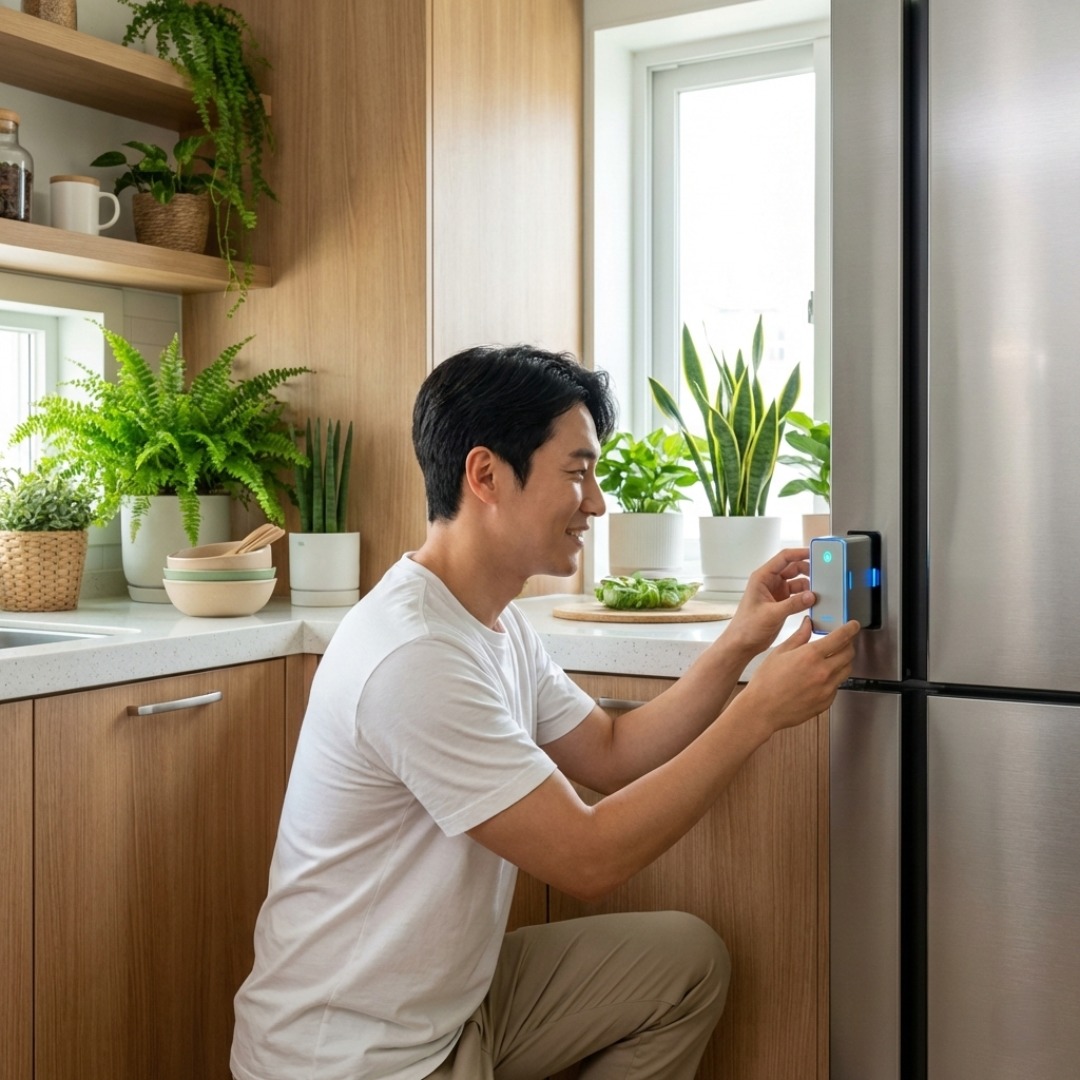 세련된 주방에서 구형 냉장고에 새로운 AI 스마트 모듈을 부착하여 성능을 업그레이드하는 한국인 남성