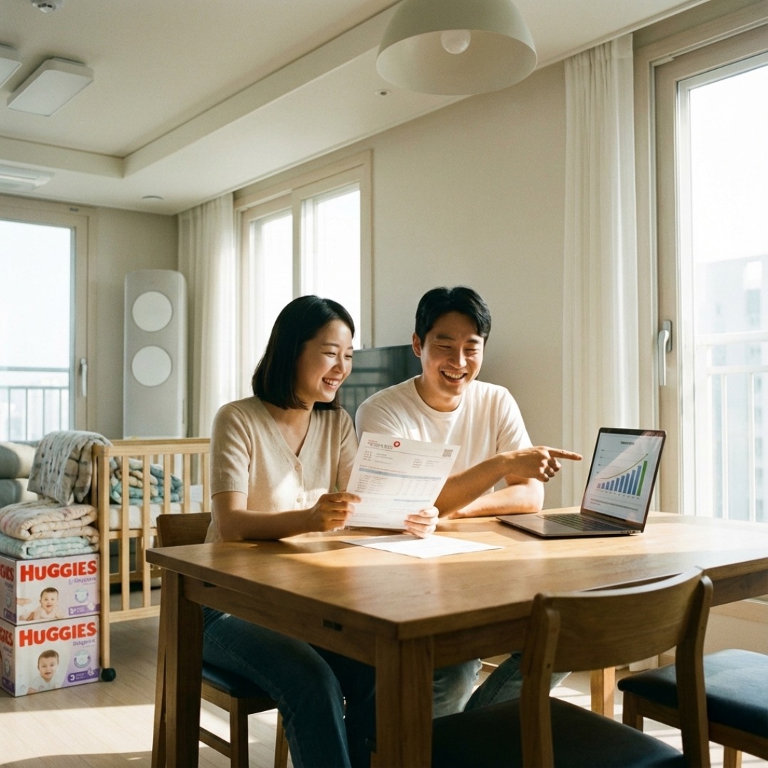 2026년 새해, 건강보험료 고지서를 확인하며 확대된 기저귀 지원금 대상 여부를 체크하고 미소 짓는 한국인 부부