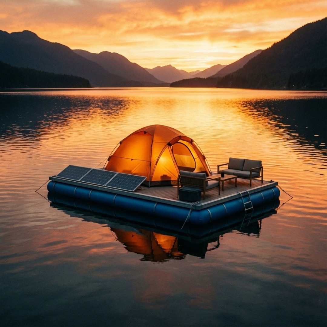 고요한 호수 위 노을을 배경으로 전용 플로팅 플랫폼 위에 세련된 캠핑 텐트가 설치되어 평화로운 분위기를 자아내는 모습