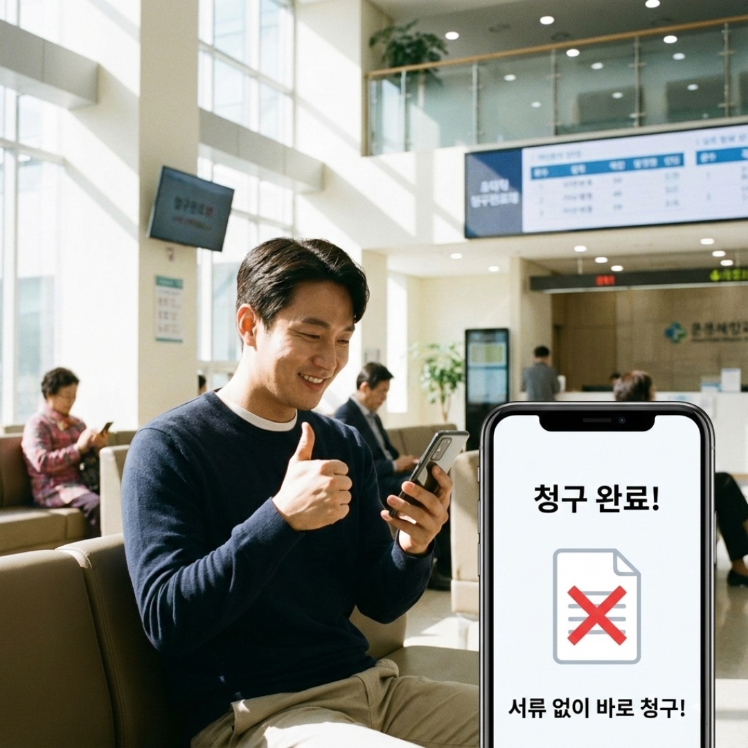 스마트폰 화면 속 '실손24' 앱을 통해 병원비 청구를 마치고 미소 짓는 2026년 한국인 직장인