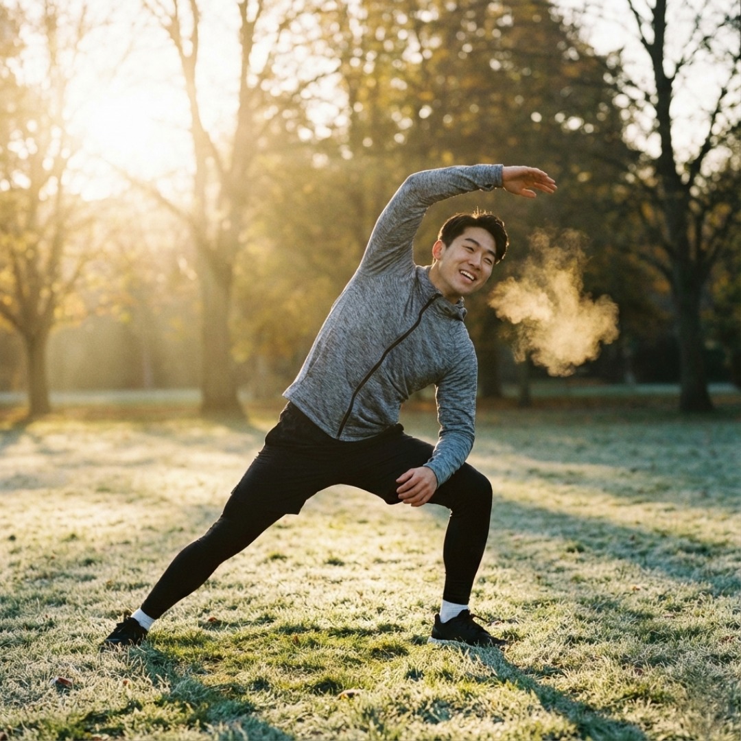 “차가운 근육을 부드럽게 깨우는 가장 좋은 방법은? 가벼운 걷기나 동적 스트레칭으로 체온을 먼저 올려주세요.”