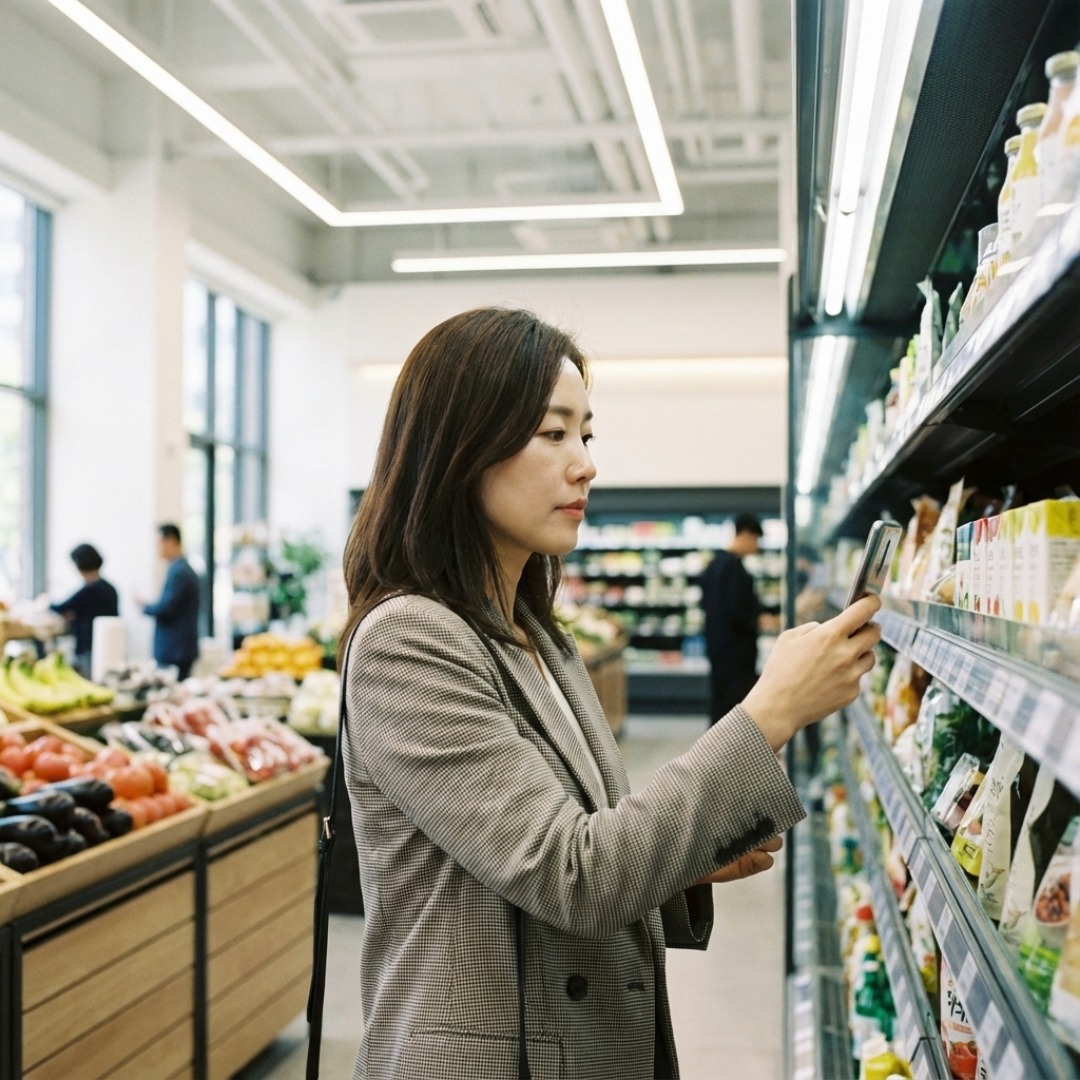 마트에서 상품의 라벨을 비교하며 프라이스 디코딩을 실천하는 한국인 여성