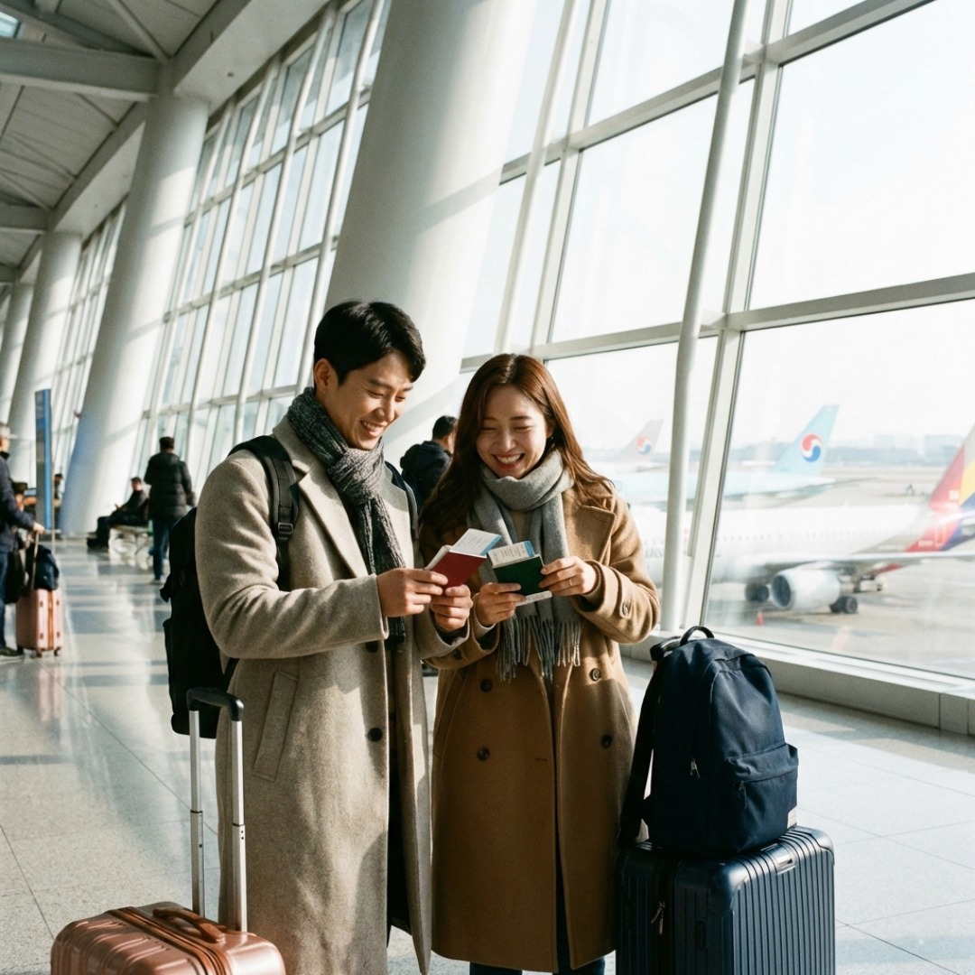 인천공항에서 설 연휴 여행을 앞두고 설레는 표정으로 여권을 든 30대 한국인 커플