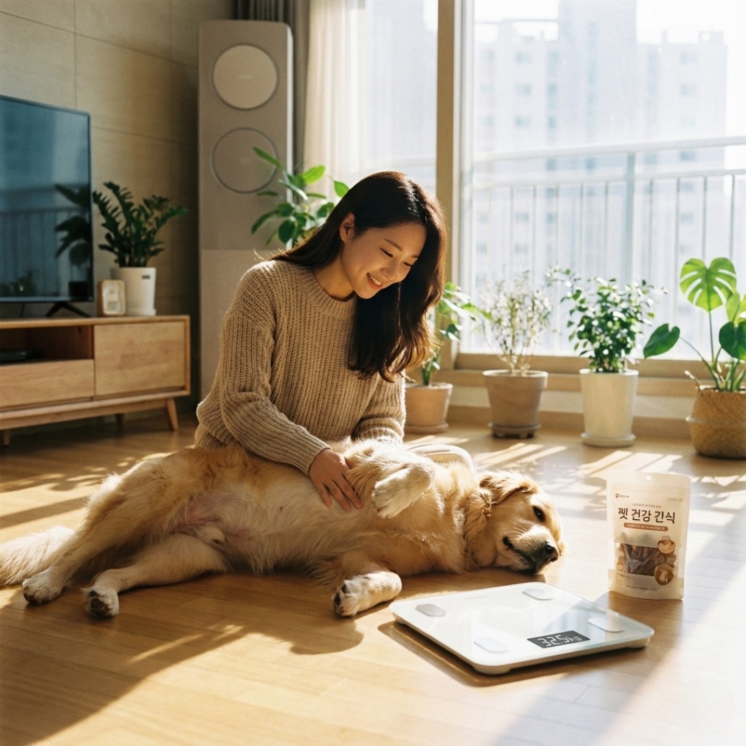 겨울철 따뜻한 거실에서 강아지의 허리 라인을 살피며 체중을 체크하고 있는 2026년 한국인 반려인