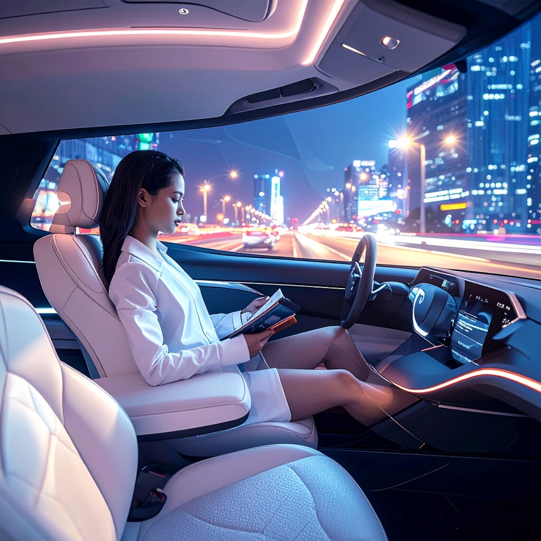 운전대 없는 자율주행 자동차 안에서 탑승자가 편안하게 책을 읽고 있는 미래지향적인 모습