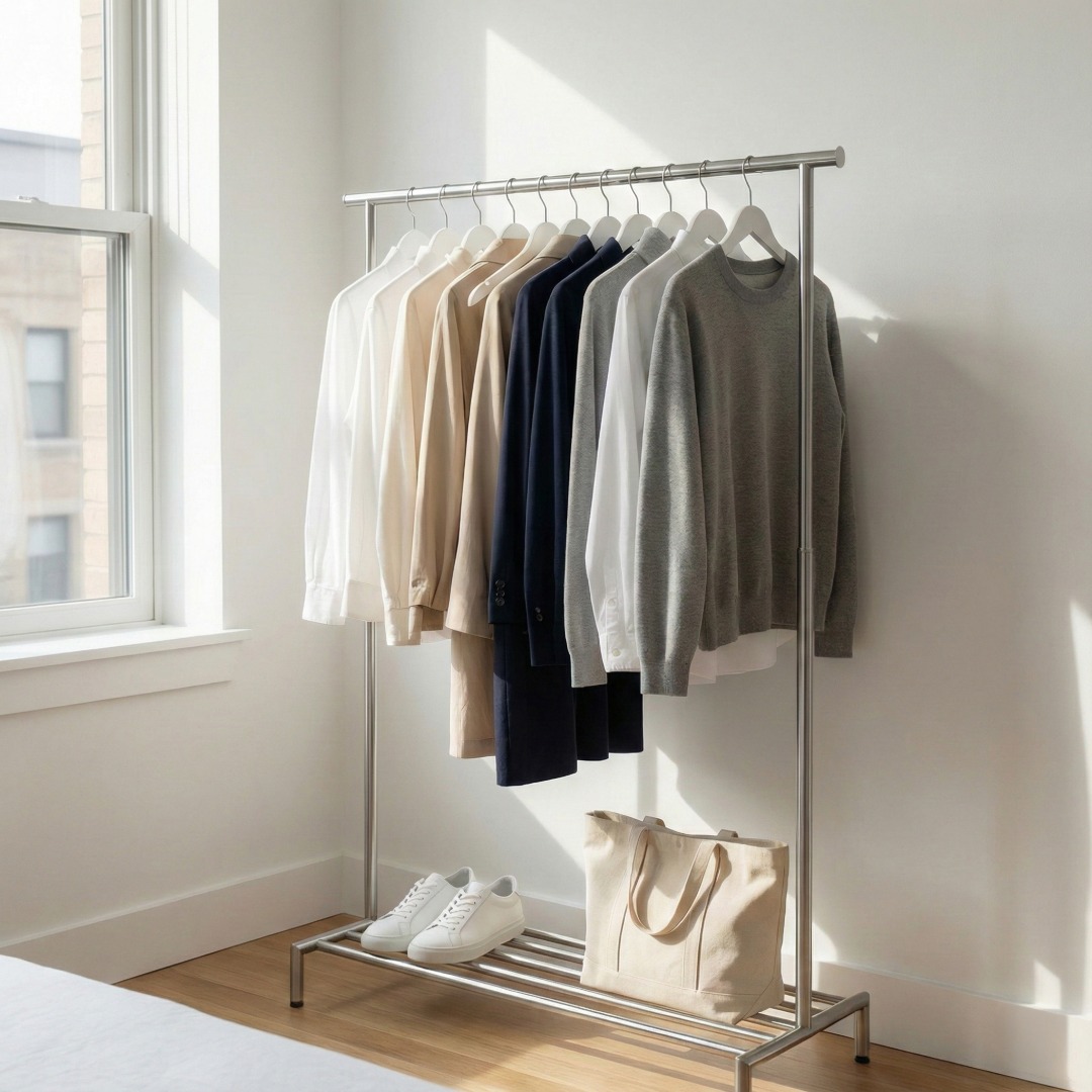 깔끔하게 정리된 행거에 무채색 계열의 옷들이 걸려 있는 모습, 미니멀 패션과 캡슐 옷장 트렌드를 상징