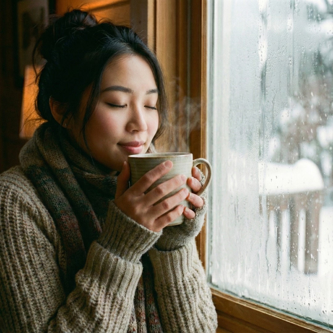 따뜻한 차가 담긴 머그잔을 두 손으로 감싸 쥐고 있는 모습, 수족냉증 완화와 체온 유지를 상징하는 이미지