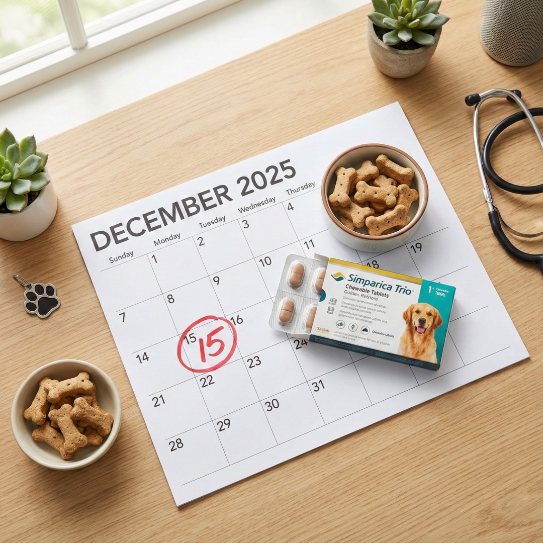 달력에 표시된 투약 날짜와 심장사상충 약, 강아지 건강 관리를 위한 매달 예방 습관을 상징하는 이미지