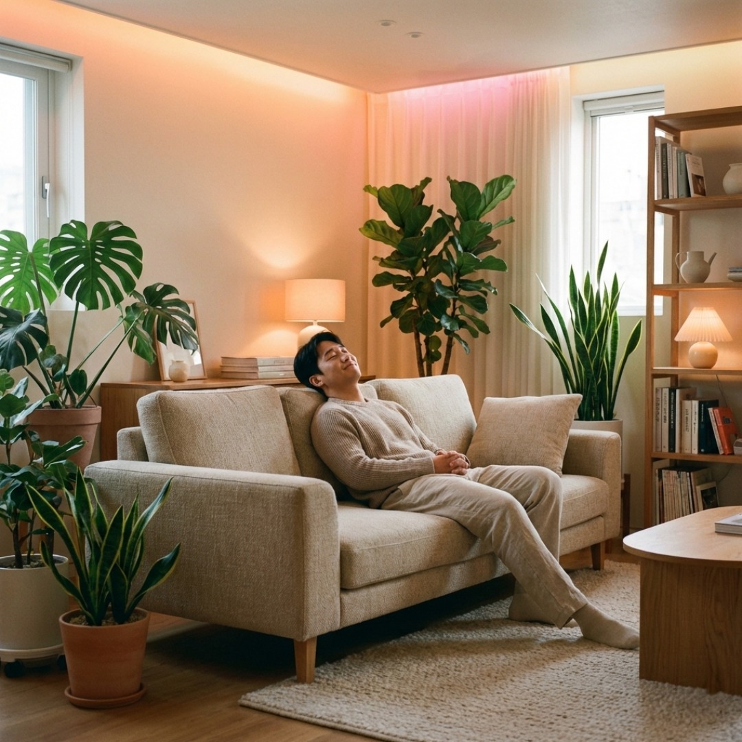 따뜻한 조명과 식물이 어우러진 감성적인 거실에서 편안하게 휴식을 취하며 정서적 안정을 얻는 30대 한국인 남성