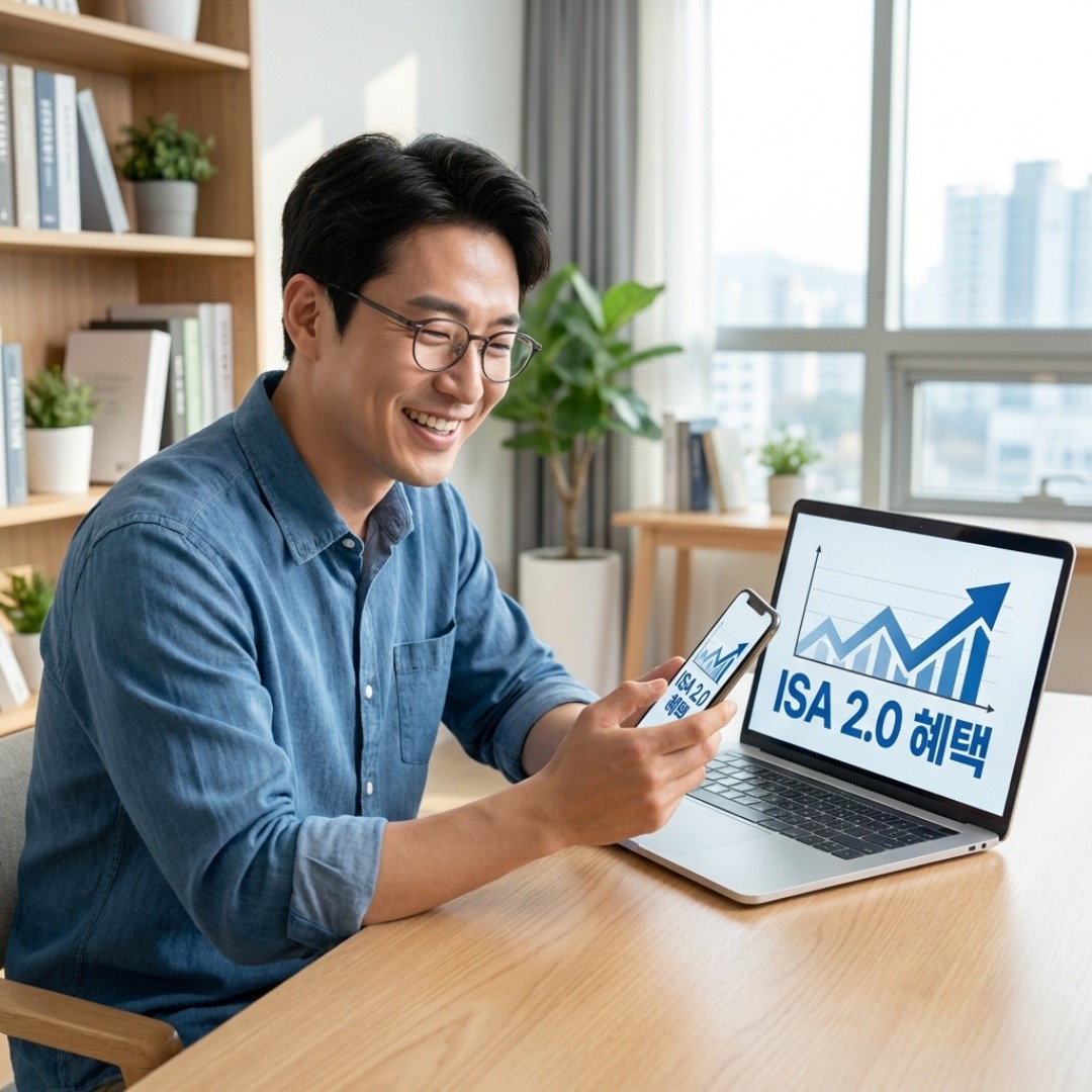 스마트폰으로 상향된 ISA 계좌의 비과세 혜택과 납입 한도를 확인하며 미소 짓는 한국인 남성