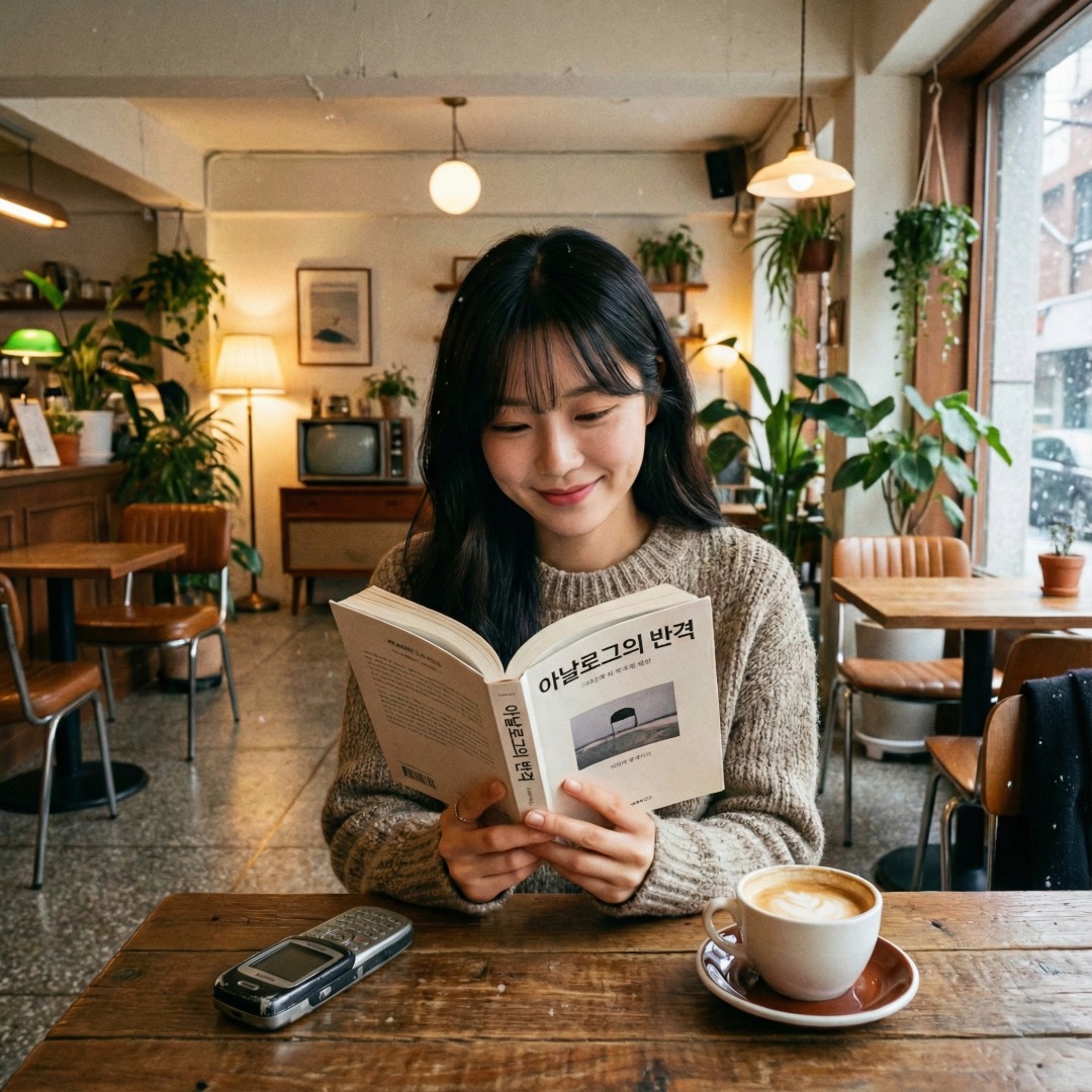 폴더폰을 옆에 두고 책을 읽는 Z세대, 디지털 디톡스와 JOMO 트렌드를 상징
