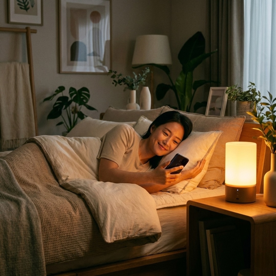 • 잠들기 1시간 전부터 조명의 색온도를 낮추고 **청색광(블루라이트)**을 차단하여 뇌가 휴식 모드로 들어갈 수 있게 돕습니다.