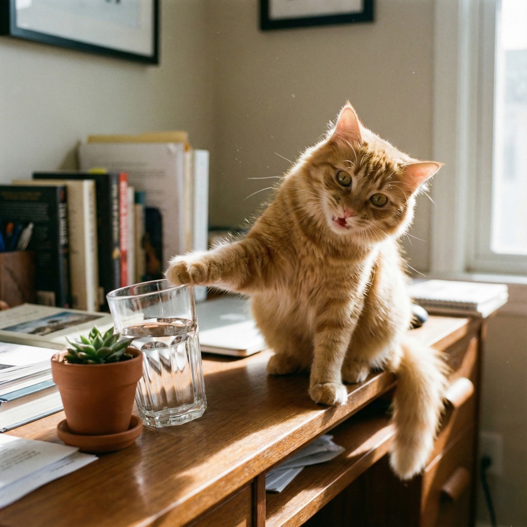 실내에서 생활하는 집고양이들은 종종 무료함을 느낍니다. 이때 책상 모서리에 아슬아슬하게 걸쳐 있는 물건은 아주 매력적인 장난감으로 보입니다.