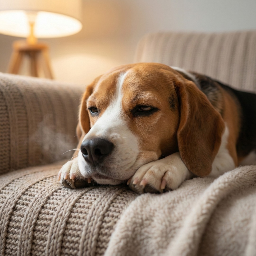 산책을 다녀오거나 밥을 배불리 먹은 뒤, 자신의 방석이나 주인 옆에 자리를 잡고 눈을 반쯤 감으며 쉬는 한숨은 **’최고의 만족’**을 의미합니다.